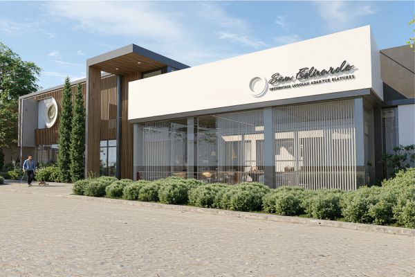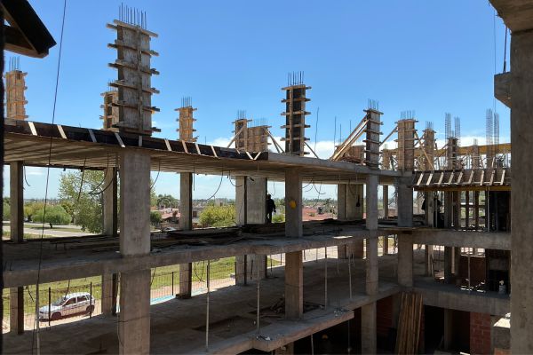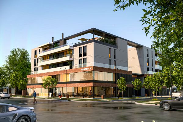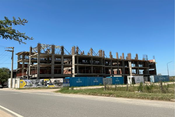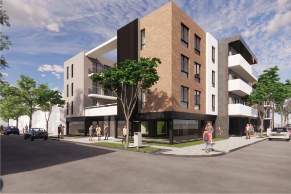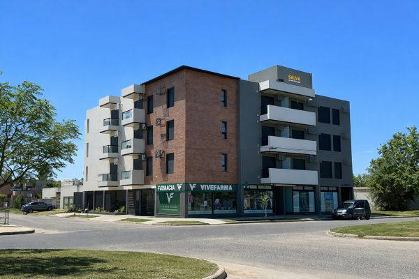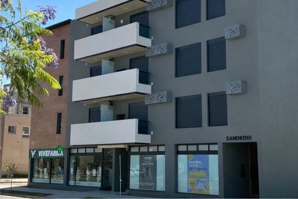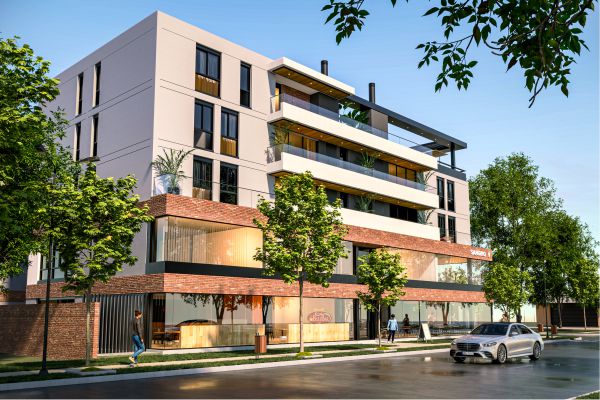 El proyecto se organiza como un edificio de uso mixto ubicado en esquina sobre una avenida, articulando actividades públicas y privadas en distintos niveles, con una superficie total construida de 4000 m². En planta baja se disponen locales comerciales que consolidan la relación con el espacio urbano, mientras que los dos primeros niveles se destinan a cocheras, resolviendo la demanda funcional del conjunto.