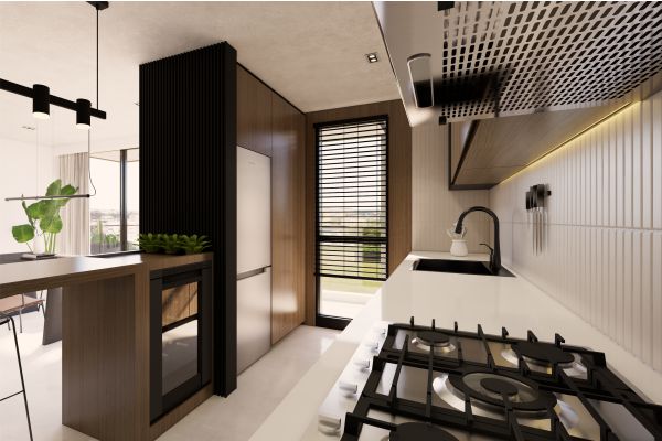 La cocina plantea este esquema abierto, priorizando visuales largas y continuidad espacial.